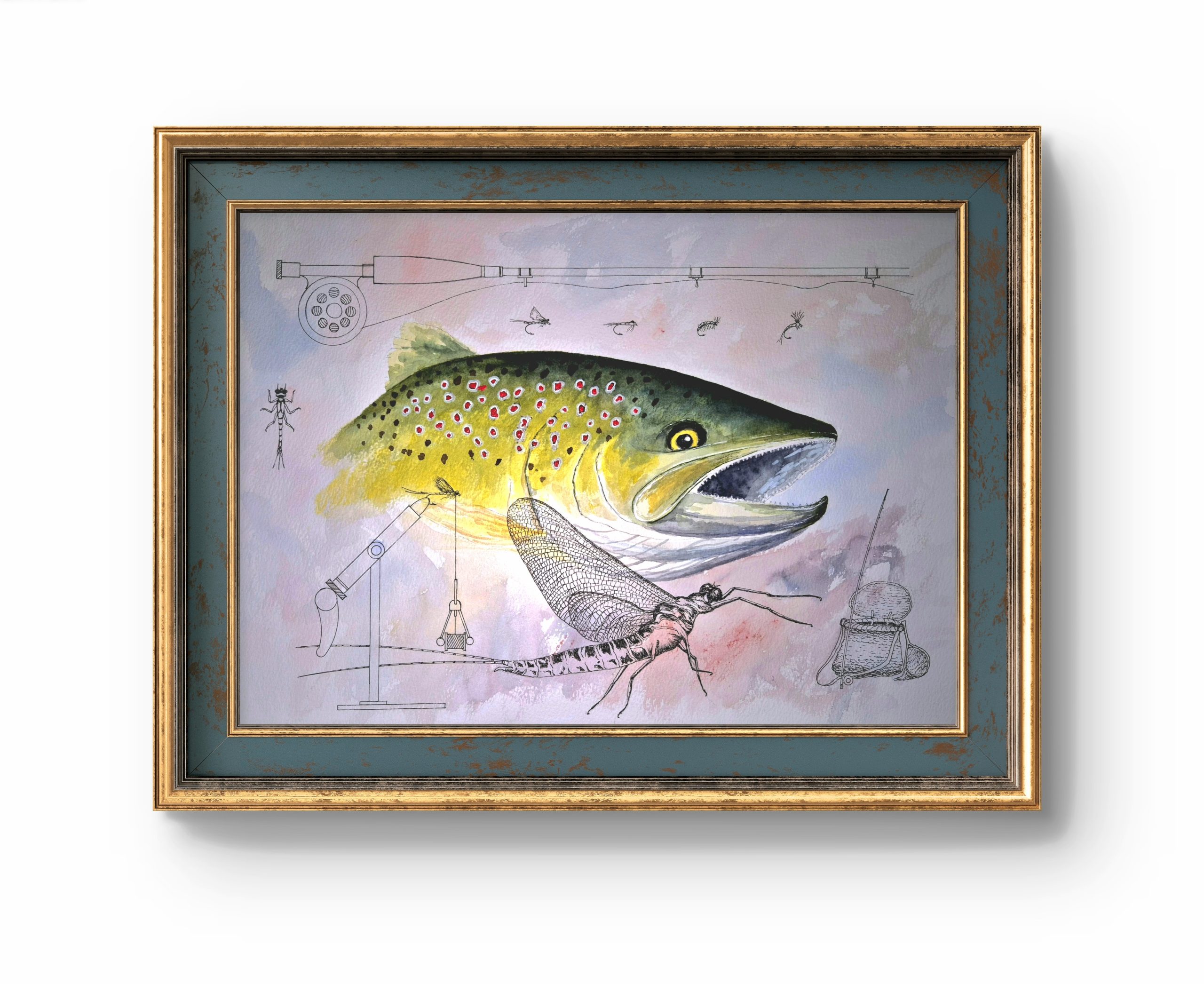 Watercolour of a brown trout with overlay of highly detailed line drawings of