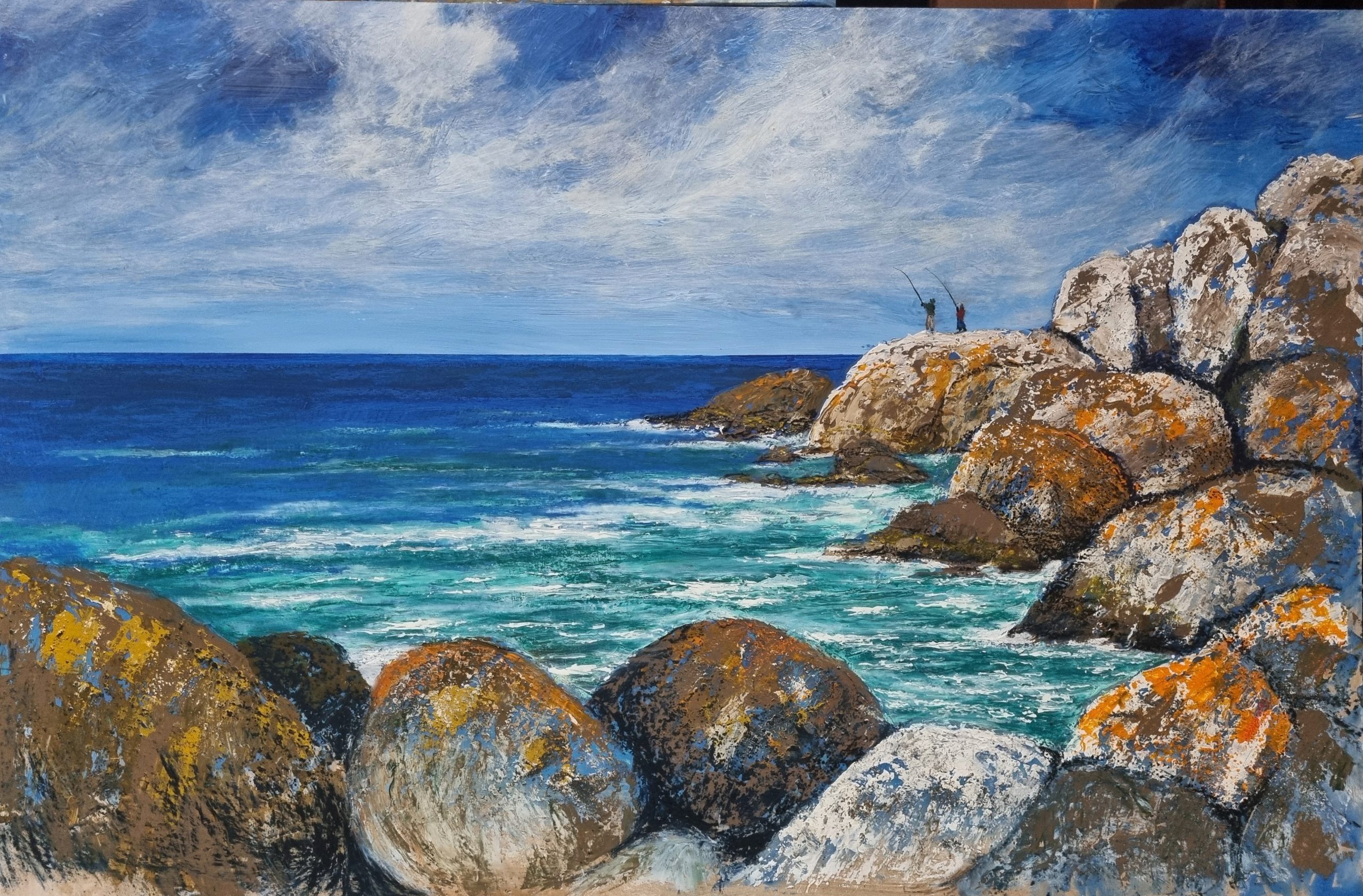 Casting lines into the pristine East coast waters of Tasmania. Watching the ebb and flow of the turquoise blue water lapping at the rocky , orange coloured rocks