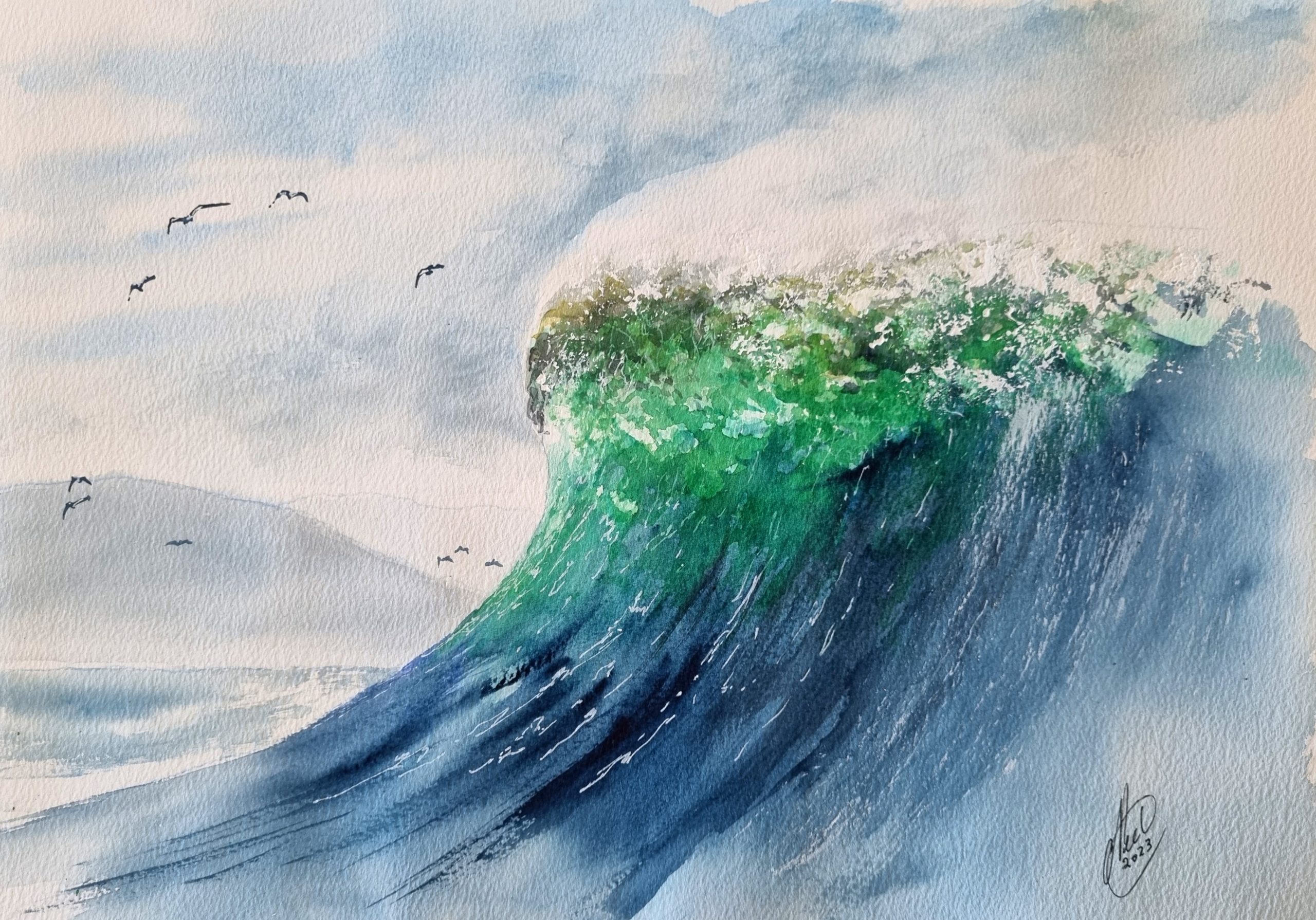 I love painting seascapes with vast beaches and rolling surf and cliffs. This time, just one lonely little wave looking for some friends to play with..